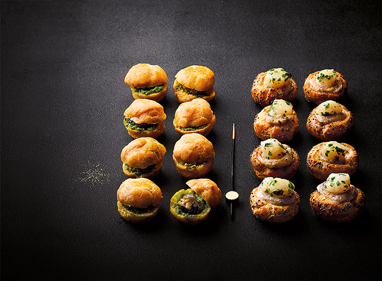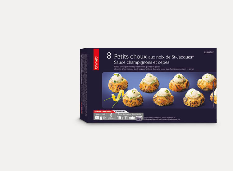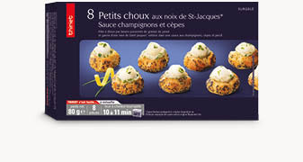 crème (crème (Lait), stabilisant : carraghénanes), noix de Saint-Jacques* (Mollusques) 18,8%, eau, œuf (Oeufs), préparation à base de champignons 7,5% (champignon de Paris grillés 5,2%, huile de colza, cèpe 0,5%, jus de citron concentré, sel, cèpe en poudre 0,1%, ail, persil, ciboulette), farine de blé (Gluten), lait demi-écrémé (Lait), carotte 3,6%, beurre (Lait) 3,1%, échalote 2,5%, persil 2,2%, graine de pavot 2,1%, amidon transformé, huile d'olive vierge extra, vin blanc, sel, ail, gluten de blé (Gluten), poivre, muscade
