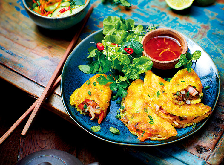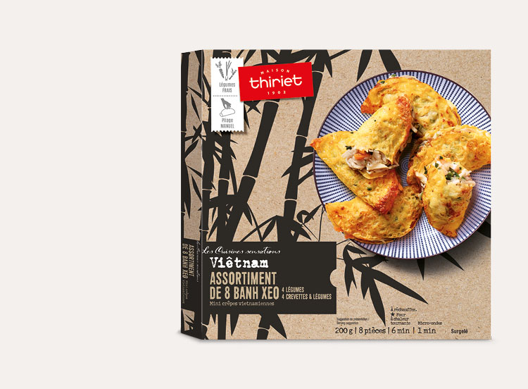Déposez 4 banh xeo encore surgelés sur une plaque recouverte d’un papier cuisson. Enfournez à mi-hauteur et laissez réchauffer 6 minutes (8 minutes dans un four traditionnel). Laissez reposer quelques minutes avant de déguster.