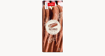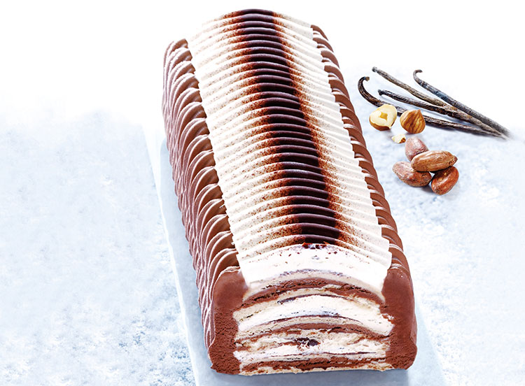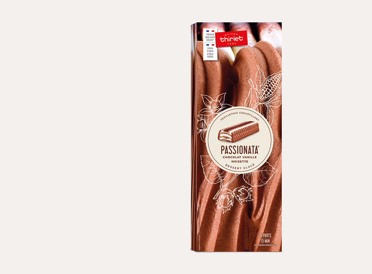 L'association délicate des crèmes glacées chocolat, vanille et noisette, à un feuilletage croustillant au cacao.
