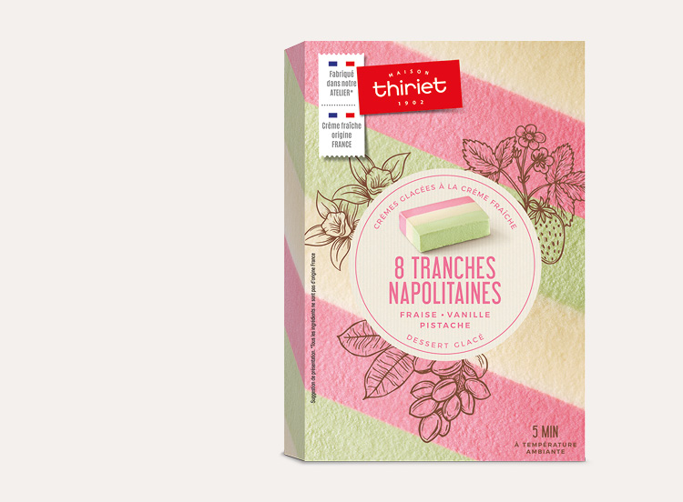 De savoureuses tranches de 3 crèmes glacées parfums vanille/chocolat/noisette.*Tous les ingrédients ne sont pas d'origine France