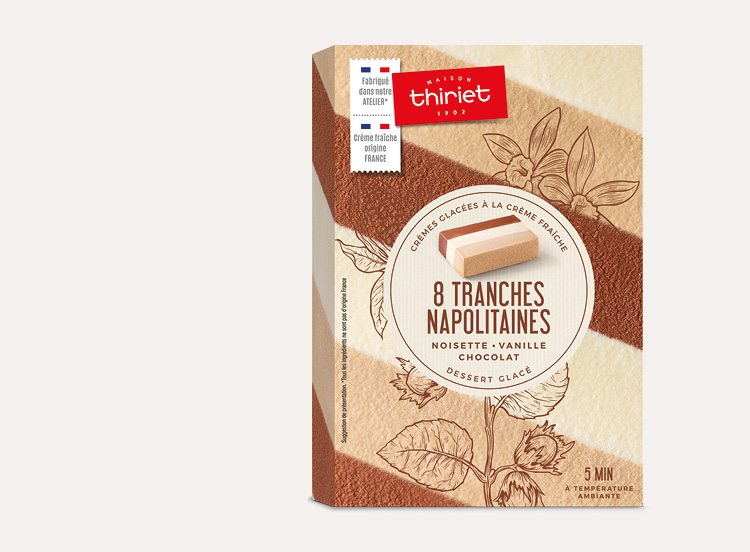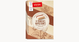 D'onctueuses tranches de 3 crèmes glacées parfums vanille, chocolat et noisette.*Tous les ingrédients ne sont pas d'origine France