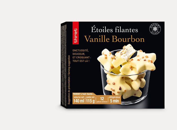 Promenez-vous à travers ces étoiles glacées : une crème glacée vanille Bourbon de Madagascar à la crème fraîche, un enrobage au chocolat blanc avec des morceaux de noisette. A grignoter ou à partager ! Vous n’en ferez qu’une bouchée !*Tous les ingrédients ne sont pas d'origine France