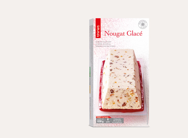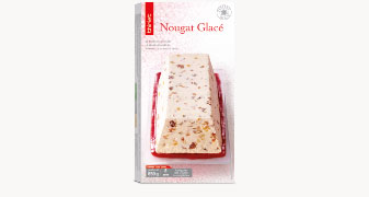 Dès la sortie du congélateur, démoulez le produit en le trempant dans l’eau chaude 4 à 5 secondes et en appuyant sur la partie supérieure. Découpez le nougat glacé.
