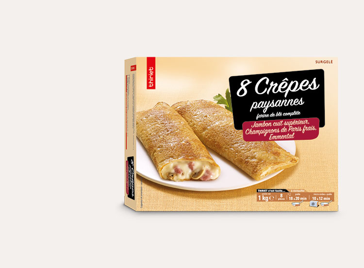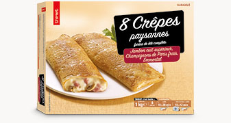 Des crêpes roulées à la farine de blé complète.Une garniture 60% préparée à base de lait frais, de jambon cuit supérieur (porc origine France), de champignons frais, d’emmental et de crème fraîche.* Ces champignons sans sulfites présentent un risque de brunissement naturel