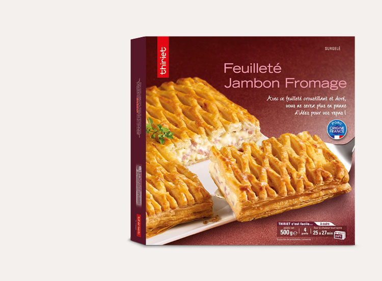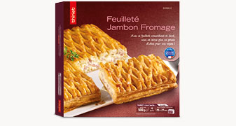 Pâte feuilletée 56% (farine de blé (gluten), eau, margarine végétale (huiles et graisses de palme et de colza, eau, sel, émulsifiant : mono- et diglycérides d'acides gras, correcteur d'acidité : acide citrique), sel, protéine de blé (gluten), enzyme : protéase, œuf (oeufs), lait entier en poudre (lait)), eau, jambon cuit supérieur 14,3% (jambon de porc (origine France), sel, sirop de glucose, dextrose, arômes naturels, antioxydant : ascorbate de sodium, conservateur : nitrite de sodium), emmental français (lait) 3,9%, crème fraîche (lait) 3,2%, œuf (oeufs), Comté AOP* (lait) 1,5%, amidons transformés, lait écrémé en poudre (lait), farine de blé (gluten), lait entier en poudre (lait), sel, arôme naturel de poivre