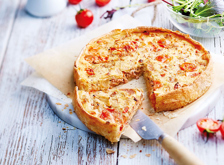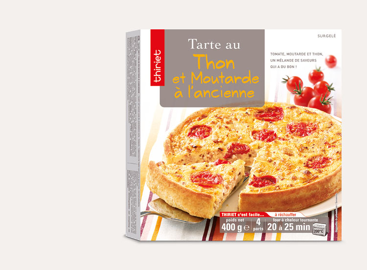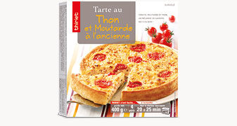 Farine de blé (gluten), thon 15% (thon listao (poisson), huile de tournesol, sel), crème fraîche (lait) 12,4%, œuf de poules élevées en plein air (oeufs) 10,8%, eau, fromage blanc (lait), tomate cerise 6,9%, graisses et huiles végétales (huile de palme, huile de colza, eau), oignon pré frit (oignon, huile de tournesol), tomate cube semi déshydratée et marinée 2,3% (tomate, huile de colza, sel, origan, ail), moutarde à l'ancienne 2% (eau, graine de moutarde (moutarde), vinaigre d'alcool, sel, vinaigre de vin, sucre, épices), moutarde de Dijon 1,2% (eau, graine de moutarde (moutarde), vinaigre d'alcool, sel), amidon transformé, sel, levure désactivée