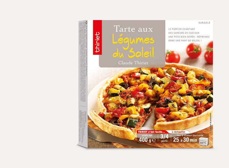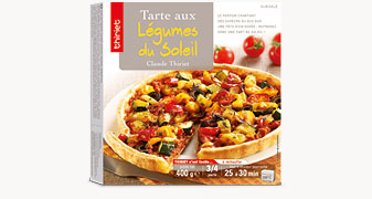 Tomate 16,1%, farine de blé (gluten), margarine (graisse et huile de palme, eau, huile de colza, sel, émulsifiant : mono- et diglycérides d'acides gras, correcteur d'acidité : acide lactique), tomate cerise 9,2%, tomate pelée concassée 8,3% (tomate, jus de tomate, correcteur d'acidité : acide citrique), eau, courgette grillée 6,9%, poivron rouge grillé 4,6%, poivron jaune grillé 4,6%, oignon 4,5%, purée de tomate, huile d'olive vierge extra, oignon préfrits 2,1% (oignon, huile de tournesol), olive noire 2% (olive noire, eau, sel), fécule, basilic, farine de riz, sel, ail, dextrose, cumin, poivre blanc