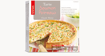 Eau, farine de blé (Gluten), saumon Atlantique (Salmo Salar) (Poisson) 19,2%, poireau 10%, œuf frais de poules élevées en plein air (Oeufs) 7,7%, crème fraîche (Lait) 7,7%, margarine (graisse et huile de palme et de colza, eau, sel, émulsifiant :mono- et diglycérides d'acides gras,correcteur d acidité: acide lactique), amidon, lait écrémé en poudre (Lait), Vermouth dénaturé, sel, échalote, poivre blanc