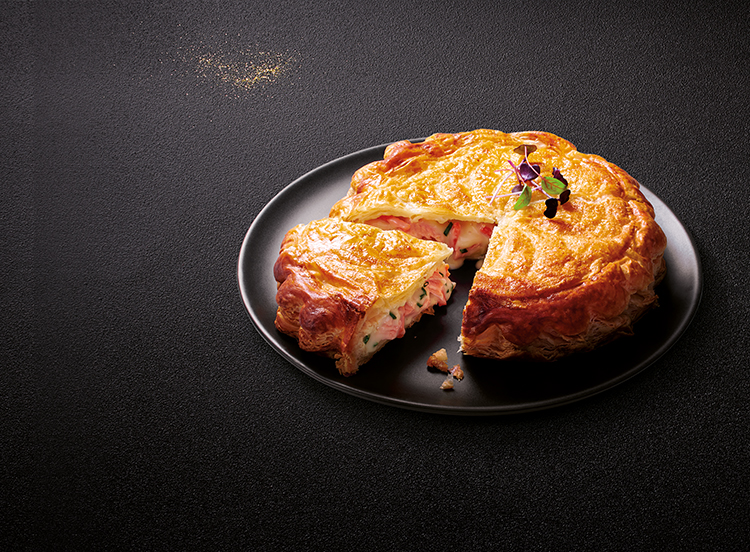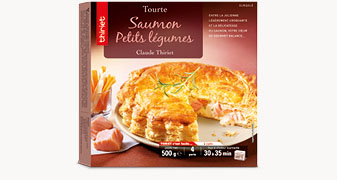 Pâte feuilletée 50% (farine de blé (gluten), margarine (huile et graisse de palme et de colza, eau, sel, émulsifiant : mono- et diglycérides d'acides gras, correcteur d acidité : acide citrique), eau, beurre (lait), œuf (oeufs), sel, protéine de blé (gluten), enzyme : protéase), saumon (poisson) 15,7%, eau, crème fraîche (lait) 8,2%, carotte 3,3%, céleri (céleri) 3,3%, échalote 2,6%, Vermouth 1,6%, beurre (lait), lait entier en poudre (lait), arômes naturels (poisson), jus de citron à base de concentré, ciboulette, citron broyé sucré (citron, sucre), amidon transformé, farine de blé (gluten), huile de palme, lactosérum (lait), protéine de lait (lait), sel