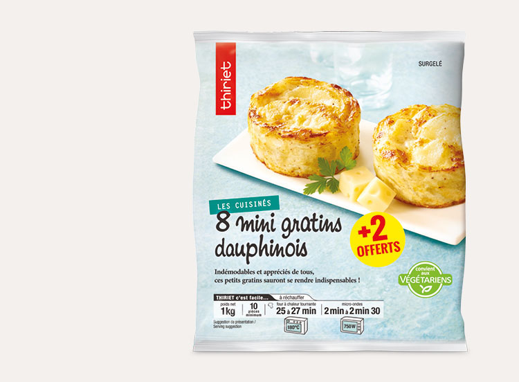 Prêts à être réchauffés en quelques minutes seulement, ces mini gratins dauphinois aux pommes de terre, crème fraîche et emmental origine France accompagneront tous vos plats qu'ils soient quotidiens ou festifs.