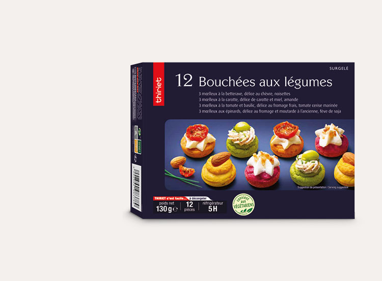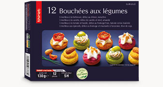 Gaies et savoureuses, ces bouchées aux légumes donnent du peps à vos apéritifs : moelleux à la betterave, délice au chèvre et noisettes ; moelleux à la carotte, délice de carotte et miel et amande ; moelleux à la tomate et basilic, délice au fromage frais et tomate cerise marinée ; moelleux aux épinards, délice au fromage et moutarde à l’ancienne, fève de soja.