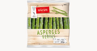 Des asperges vertes au goût très fin, cultivées et récoltées à la main en Italie, à déguster toute l'année.La maison Thiriet garantit pour ce légume l'absence de résidu de pesticides à travers une agriculture plus vertueuse, plus respectueuse de l'environnement et de la biodiversité. (Seuil de quantification < 0,01 mg/kg pour une recherche de 400 molécules minimum.). Elles peuvent se déguster chaudes, poêlées au beurre pour accompagner poissons, viandes blanches, risotto de volailles avec une sauce hollandaise. Vous pouvez aussi les présenter froides, en hors d’œuvre, avec une vinaigrette, une mayonnaise, des poissons froids, une crème citronnée, des aspics.
