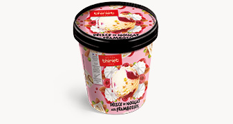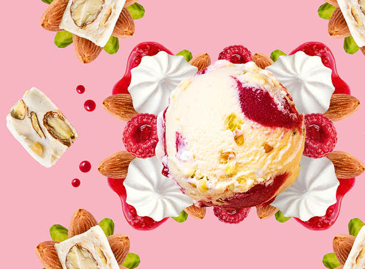 Idéale pour une pause gourmande, cette délicieuse crème glacée au nougat de Montélimar est agrémentée d'éclats de fruits secs et biscuit meringué, avec une généreuse sauce à la framboise. Un pur moment de gourmandise !