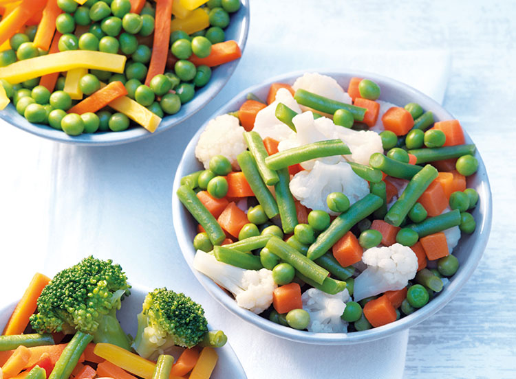 Mélange de légumes : brisures de choux-fleurs* (25,6% mini.), carottes en cubes* (19,2% mini.), haricots mange-tout coupés* (19,2% mini.), petits pois doux mi-fins* (16% mini.).