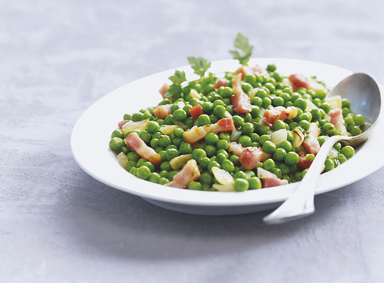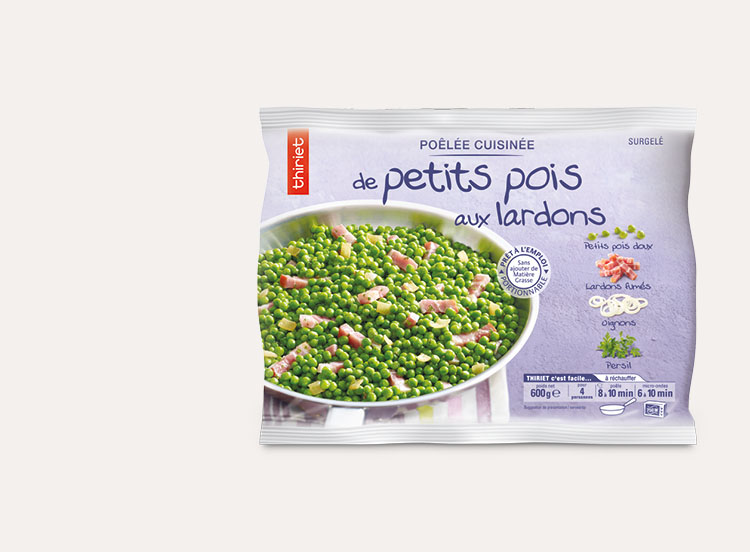 Des petits pois doux extra-fins fondants, tout prêts, cuisinés avec lardons fumés, oignons, et relevés d'une légère note persillée, pour vos accompagnements de viandes ou volailles. Se réchauffent en moins de 10 minutes au micro-ondes, suivant la quantité désirée.