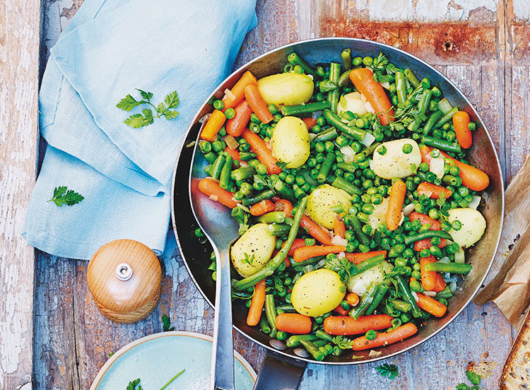 Un mélange de légumes printanier, composé de petits pois doux, de petites pommes de terre entières, d'haricots mange-tout coupés, de jeunes carottes entières et d'oignons émincés.