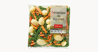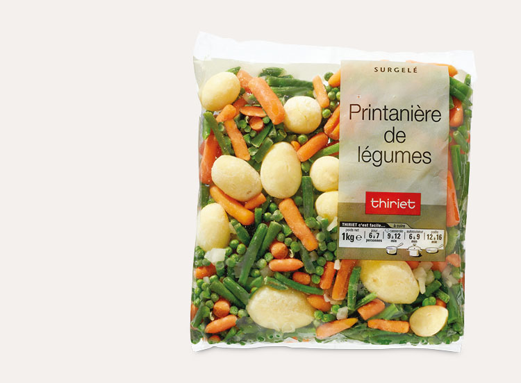 Petits poix doux (20% mini.), pommes de terre entières (20% mini.), haricots mange-tout coupés (16% mini.), jeunes carottes entières (16% mini.), oignons émincés (8% mini.).