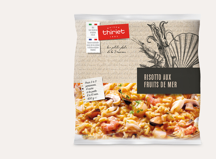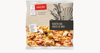 Ce risotto est à base de riz San Andrea origine Italie associé à des fruits de mer : moules du Pacifique, anneaux de calmar, crevettes et noix de St-Jacques*. Le tout est enrobé d’une sauce crémée aux champignons de Paris, à l’emmental et au parmesan AOP**.