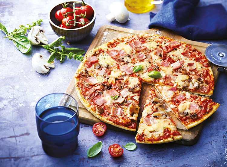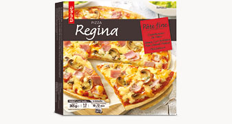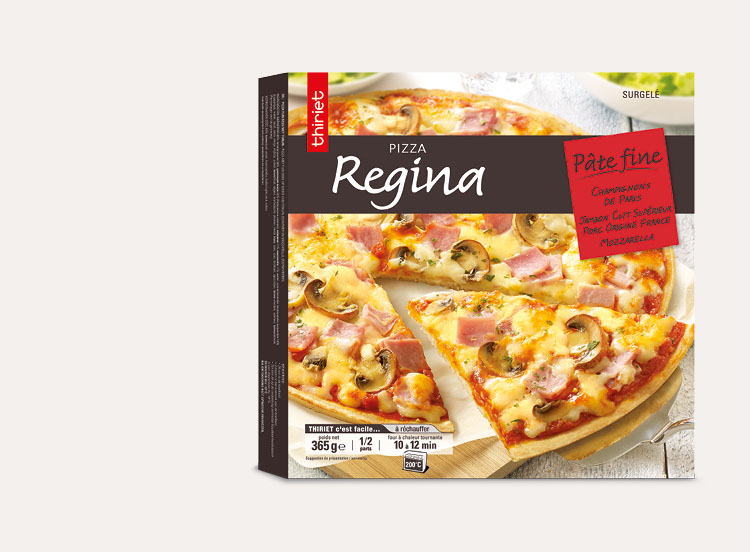 Farine de blé (Gluten), purée de tomate, eau, champignon de Paris 8,2%, jambon cuit supérieur fumé 8,2% (viande de porc (origine France), sel, sucre, antioxydants : extrait de romarin - ascorbate de sodium, conservateur : nitrite de sodium, fumée naturelle au bois de hêtre), edam 7,9% (Lait), mozzarella 7,9% (Lait), huile de colza, levure de boulangerie, sucre, sel, fromage à pâte dure (Lait), crème fraîche (Lait), ail, plantes aromatiques, amidons, épices, protéine de blé (Gluten), amidon de blé (Gluten).