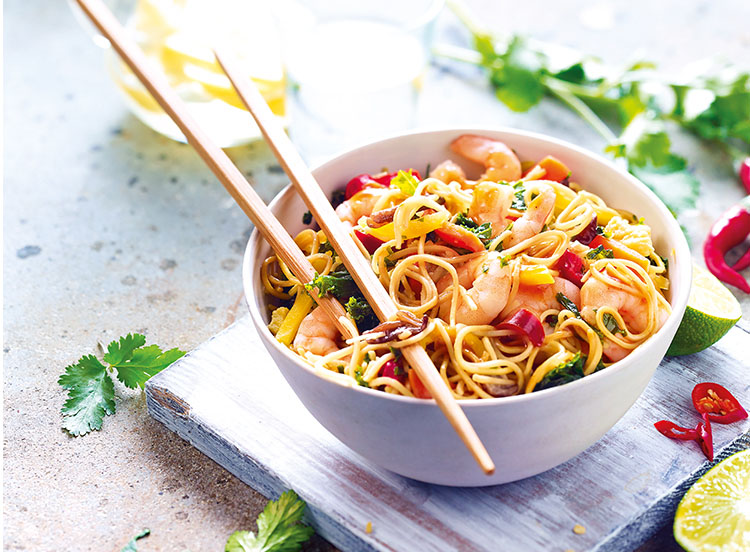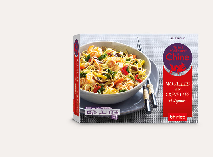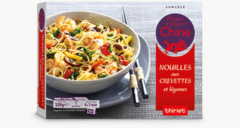 Cuisiné à base de sauce soja, de gingembre et de ciboulette, ce plat d'inspiration asiatique est composé de nouilles chinoises cuisinées avec des crevettes et un mélange de légumes légèrement croquants : carottes, chou vert, poivrons et champignons noirs. Une recette colorée riche en parfums exotiques.*Chez Thiriet, les crevettes de notre recette chinoise sont déveinées à la main. Ce geste consiste à retirer la partie brune se trouvant sur le dos de la crevette afin de garantir une qualité organoleptique optimum.