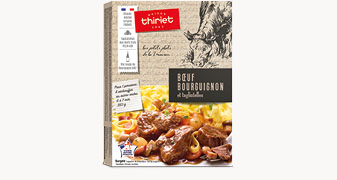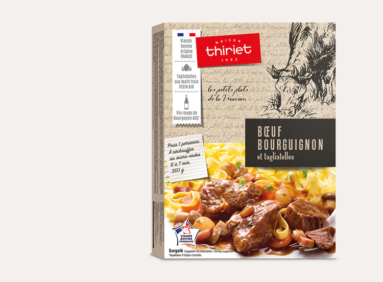 Le bœuf bourguignon, un grand classique de la gastronomie de cette région. On aime ce plat réconfortant, qui a gagné son succès grâce à un goût inimitable ! Découvrez notre recette, des morceaux de viande bovine (origine France) marinés au vin de Bourgogne AOC*, cuits longuement, plus de 6 heures, lui donnant ainsi une tendreté incomparable. La viande est nappée d'une sauce au vin de bourgogne AOC*, le tout accompagné de tagliatelles aux œufs frais issus de poules élevées en plein air.
