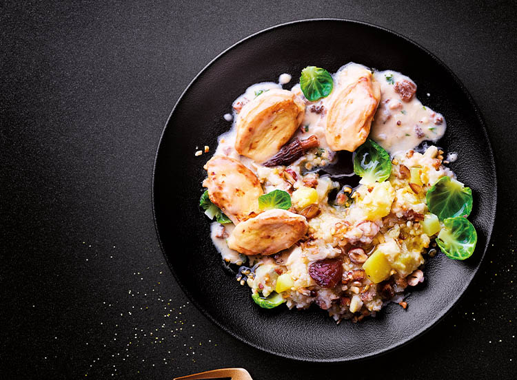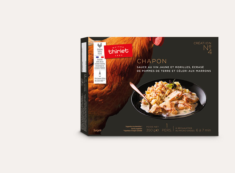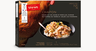 Pourquoi attendre d’être nombreux pour déguster du chapon ? N'hésitez plus avec ces morceaux de filets de chapon nappés d’une sauce onctueuse cuisinée à la crème fraîche, au beurre (origine France), morilles et vin jaune AOC**, accompagnés d’un écrasé de pommes de terre, céleri et marrons saupoudré de noisettes croquantes : un plat complet d'exception pour une personne.**Appellation d'Origine Contrôlée