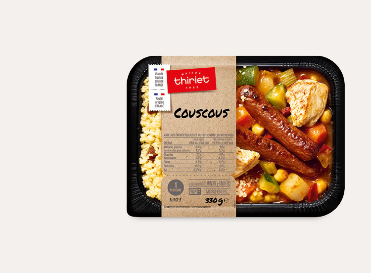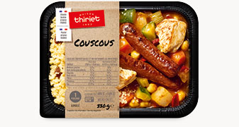 Une recette de couscous avec des merguez sans nitrite ajouté, des émincés de filets et aiguillettes de poulet origine France, accompagnés de semoule aux raisins secs et légumes relevés d'un jus épicé. A réchauffer en quelques minutes au micro-ondes avant dégustation en solo pour se régaler au déjeuner ou au dîner.
