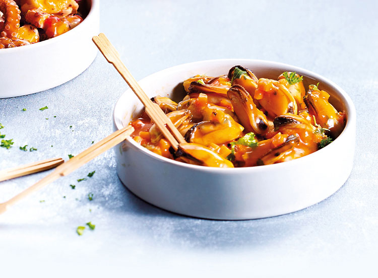 A l'heure des tapas et des entrées ensoleillées, cette recette de moules décoquillées, agrémentées d'une sauce à la tomate, avec morceaux de carottes et d'oignons et relevée d'huile d'olive vierge extra, d'échalotes et de vinaigre de Xérès, seduit tous les gourmands.