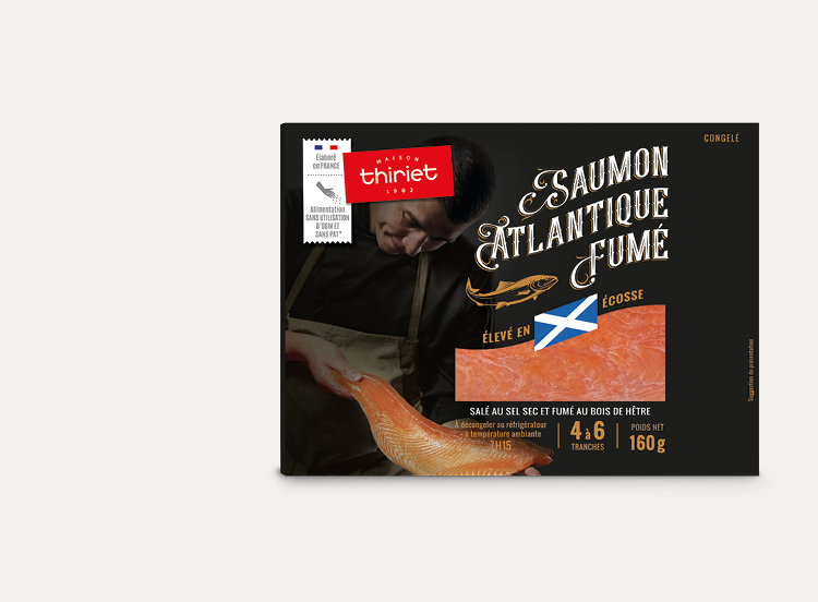Elevé en Ecosse, le saumon est ensuite salé au sel sec et fumé au bois de hêtre en France pour une finesse aromatique.*PAT : Protéines d'Animaux Terrestres, Thiriet a fait le choix de ne pas utiliser de farines d'animaux terrestres dans l'alimentation de ces saumons. Ces saumons sont également nourris sans OGM (Organismes Génétiquement Modifiés) <0,9%.