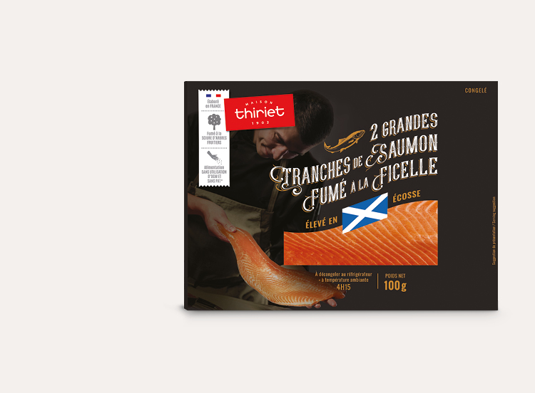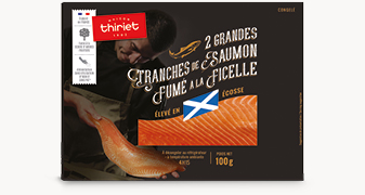 Chez Thiriet, nous avons fait le choix pour ce produit, d'un fumage à la ficelle. Cette méthode de fumage, où le filet est fumé suspendu par la queue, permet aux chairs de s'étirer et donne au saumon une texture fondante préservée par un tranchage manuel.