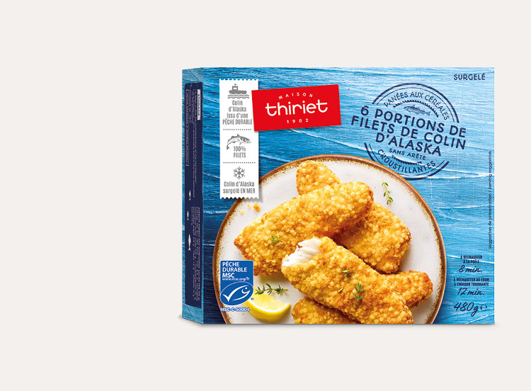 Un poisson sauvage surgelé en mer. Des portions de filets de colin d'Alaska qui provient d’une pêcherie qui a répondu à un référentiel environnemental pour une pêche durable et bien gérée, de qualité sans arête, enrobées d'une chapelure croustillante aux céréales enrichie d'un ingrédient naturel : une algue qui apporte du calcium, du fer et du magnésium