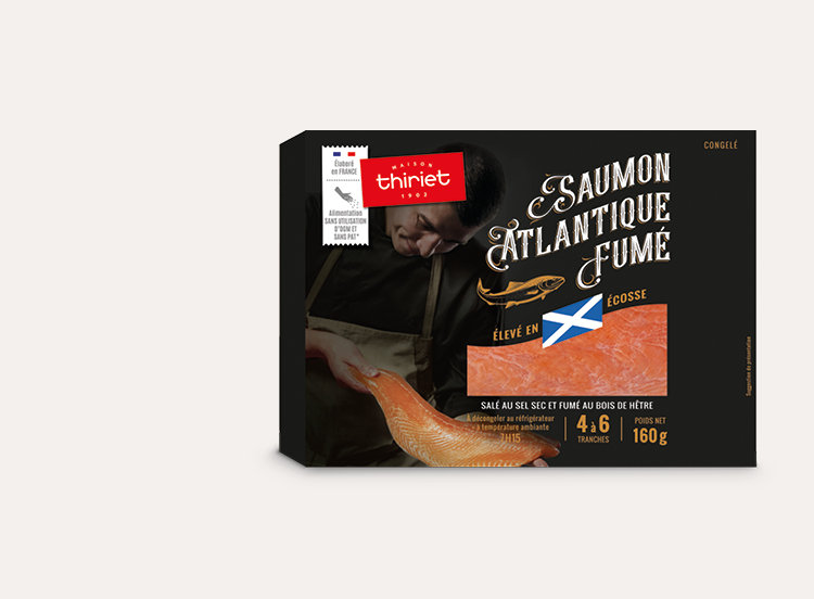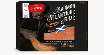 *PAT : Protéines d'Animaux Terrestres, Thiriet a fait le choix de ne pas utiliser de farines d'animaux terrestres dans l'alimentation de ces saumons. Ces saumons sont également nourris sans OGM (Organismes Génétiquement Modifiés) <0,9%.