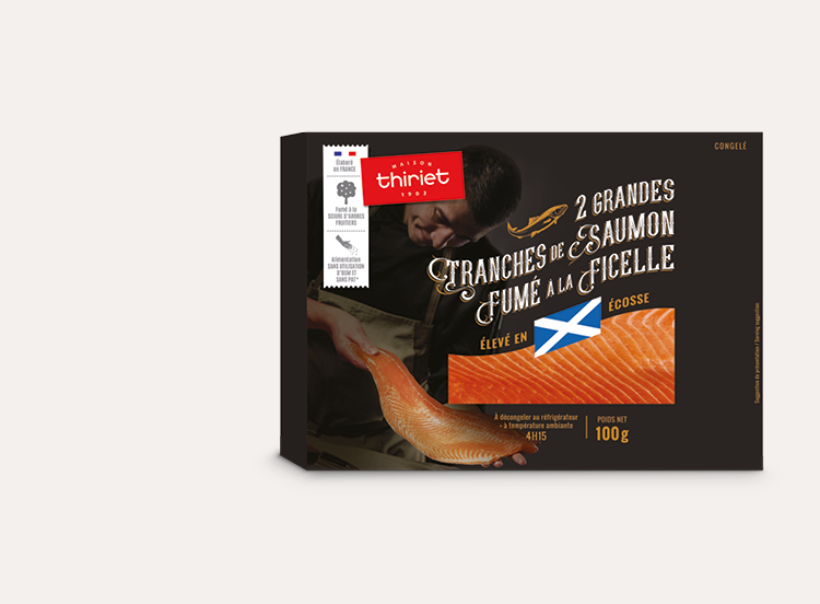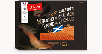 Ce fumage à la ficelle confère au saumon fumé une texture particulièrement fondante préservée par un tranchage manuel.*PAT : Protéines d'Animaux Terrestres, Thiriet a fait le choix de ne pas utiliser de farines d'animaux terrestres dans l'alimentation de ces saumons. Ces saumons sont également nourris sans OGM (Organismes Génétiquement Modifiés)<0.9%.Chez Thiriet, nous avons fait le choix pour ce produit, d'un fumage à la ficelle. Cette méthode de fumage, où le filet est fumé suspendu par la queue, permet aux chairs de s'étirer et donne au saumon une texture fondante préservée par un tranchage manuel.