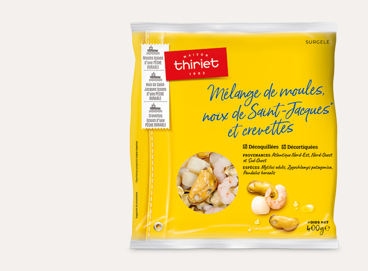 Moules décoquillées cuites MSC 46% (Mollusques, Mytilus edulis, pêchée à la drague en Atlantique Nord Est- Limfjord), noix de St-Jacques MSC 27% (Mollusques, Zygochlamys patagonica, pêchée au chalut en Océan Atlantique Sud Ouest, origine Argentine), crevettes nordiques décortiquées cuites MSC 27% (Crustacés, Pandalus borealis, pêchée au chalut en Atlantique Nord Ouest (A*) ou en Océan Atlantique Nord Est- Mer de Barents, Mers de Norvège et/ou Est Groenland (B*)).