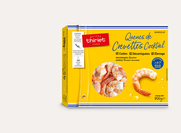Elevées en Equateur, ces crevettes proviennent d’une ferme aquacole qui a répondu à un référentiel pour une aquaculture responsable. Déjà cuites, partiellement décortiquées, elles sont prêtes à être disposées au centre d’un plateau de fruits de mer, d'un buffet ou à être savourées à l’heure de l’apéritif.* Protéines d'Animaux Terrestres, Thiriet a fait le choix de ne pas utiliser de farines d'animaux terrestres dans l'alimentation de ces gambas. Ces gambas sont nourries sans OGM (Organismes Génétiquement Modifiés) < 0,9%.