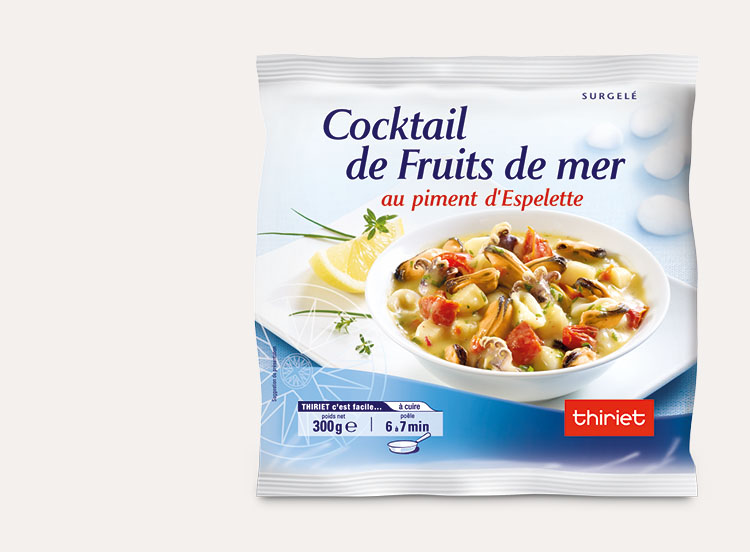 Mélange de fruits de mer 71% [moules du Pacifique décoquillées 42% (moules, eau), têtes et pattes de calmar 28% (calmar, eau, sel), noix de Saint-Jacques* 21%, anneaux de calmar 8% (calmar, eau, sel)], tomate mi-séchée 10%, huile d’olive vierge extra, oignon 5%, beurre, échalote, eau, jus de citron, basilic, ail, sel, amidon transformé, persil, extrait de poivre, piment d’Espelette AOP** 0,02%.