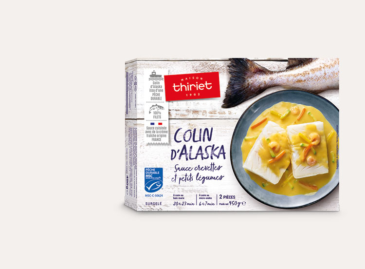 Portion de filets de colin d'Alaska (poisson) 53,3%, crème fraîche (lait) (origine France) 16,7%, eau, crevette décortiquée cuite (crustacés) 6,5%, carotte jaune 3,7%, courgette 2,7%, carotte 2,1%, arômes naturels (crustacés, poisson, lait, colorants : extrait de paprika - rouge de betterave), oignon, lait entier en poudre (lait), fumet de poisson (maltodextrine, sel, farine de blé (gluten (Blé)), poisson en poudre (poisson), céleri-rave (céleri), poireau, oignon, sucre, extrait de levure, crème en poudre (lait), arôme naturel (poisson), huile d'olive, épices et plantes aromatiques, crevette en poudre (crustacés), extrait de vin blanc), amidon transformé, vin blanc concentré, huile de tournesol, purée de tomate double concentrée, colorant : extrait de paprika, persil, ail en purée, épaississant : gomme xanthane, vinaigre d'alcool