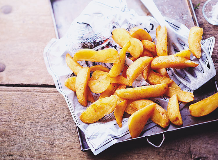 Des quartiers de pommes de terre, avec peau et épices douces.
