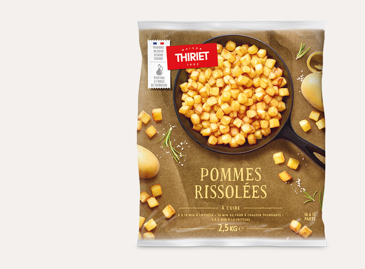 Plongez les pommes rissolées encore surgelées dans l’huile chaude (175°C) par PETITES QUANTITES (100 g / litre d’huile) pendant 3 à 5 minutes, jusqu’à ce qu’elles soient croustillantes et dorées. Égouttez-les avant de les servir.