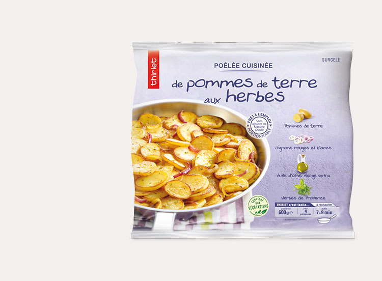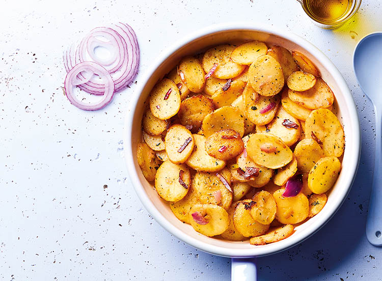 Pour ensoleiller vos assiettes, ces pommes de terre en rondelles sont assaisonnées à l’huile d’olive vierge extra et aux herbes de Provence, avec un émincé d’oignons rouges et blancs. Une promesse de saveurs.