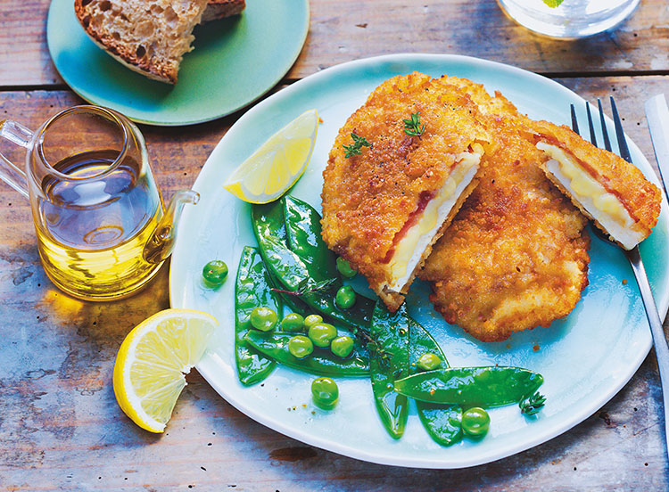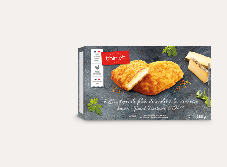 Escalope de poulet 51% (filets, volaille française), chapelure (farine de blé (gluten (blé)), levure, sel), Saint-Nectaire AOP* pasteurisé (lait) 10,2%, bacon de dinde fumé 10,2% (viande de dinde (volaille française) 9.6%), sel, dextrose de blé, arôme de fumée, antioxydant: ascorbate de sodium, conservateur: nitrite de sodium, ferments, fumée), eau, pomme de terre déshydratée, farine de blé (gluten(blé)), gluten de blé (gluten(blé)), amidon de blé (gluten(blé)), sel, huile de tournesol.