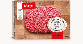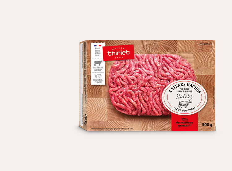 Des steaks hachés façon bouchère pur viande bovine, avec 12% de matières grasses. Steaks à la texture aérée, tendre et au hachage épais "façon bouchère", 100% muscle, origine France, race salers.