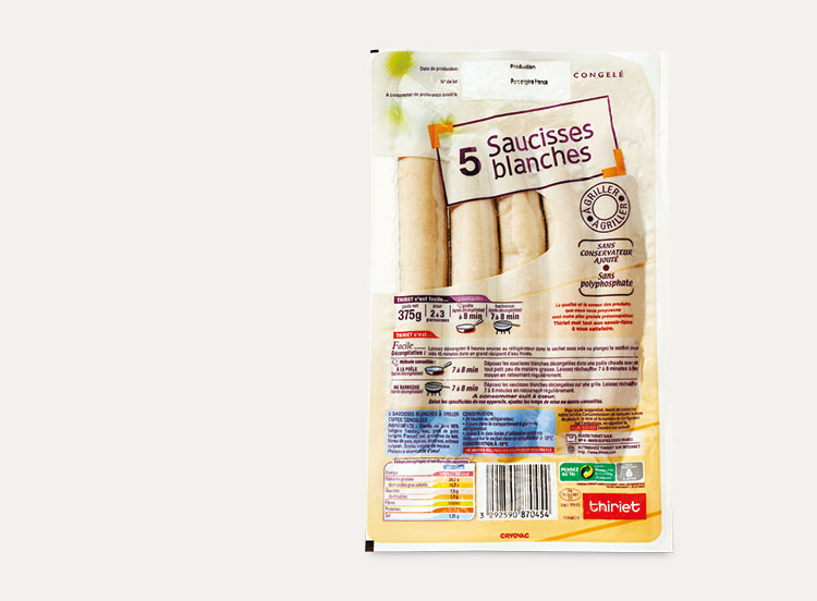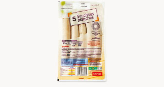 5 saucisses blanches à griller à la viande de porc origine France. Boyau naturel, sans conservateur ajouté et sans polyphosphate. Idéales pour les barbecues.