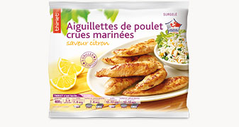 Aiguillette de poulet (Volaille Française) 90,2%, eau, enrobage 1.9% (maltodextrine, sel, sucre, épices, arôme naturel, zeste de citron 0,2%, jus de citron jaune 0,1%, tomate, huile de tournesol), sel, spécialité à base de jus de citron concentré avec pulpe 0,1% (eau, jus de citron jaune et d'orange concentré, pulpe de citron, acidifiant: acide citrique, extrait naturel de citron), fécule de pomme de terre, arôme naturel