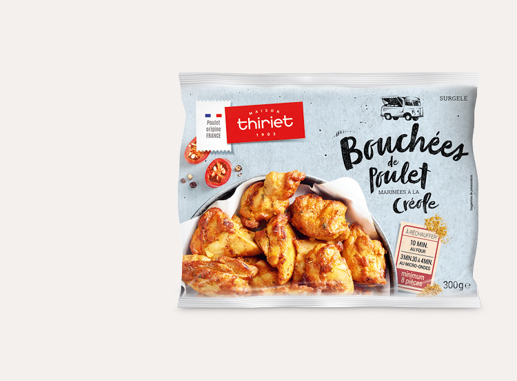 Morceaux de viandes de poulet, cuits et marinés "créole" (oignons, curry), à réchauffer.