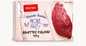Bavette d'aloyau à bifteck, tranchée à la main et emballée sous vide. Viande aux fibres longues qui lui donnent une texture tendre et savoureuse.Viande bovine certifiée VBF (Viande Bovine Française).