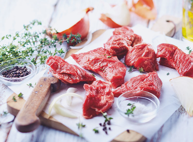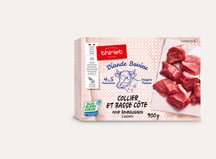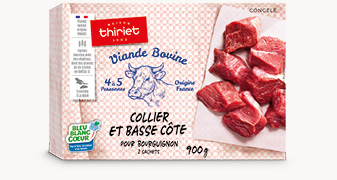 Animaux nourris avec une alimentation à base de céréales et de graines de lin naturellement riches en Oméga 3, produit contrôlé Bleu-Blanc-Coeur. Viande tranchée main, certifiée VBF. Des morceaux de collier et basse-côte à cuire.