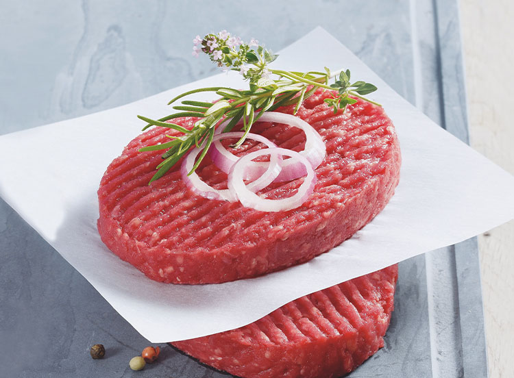 Pure viande bovine. Pourcentage de matières grasses inférieur à 15%. Rapport collagène sur protéines de viande inférieur à 15%. Origine France - Elaboré en France.