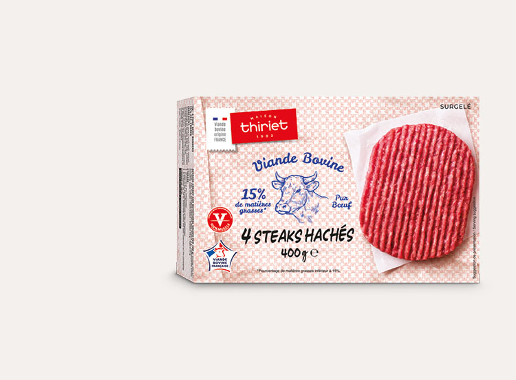 4 steaks hachés pur boeuf 15% de matières grasses VBF (Viande Bovine Française), 100% muscle, emballés individuellement.