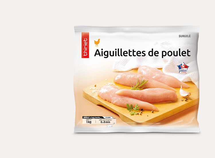 Des aiguillettes de poulet natures. Poulet origine France. Des morceaux pratiques et prêts à cuisiner à la poêle.